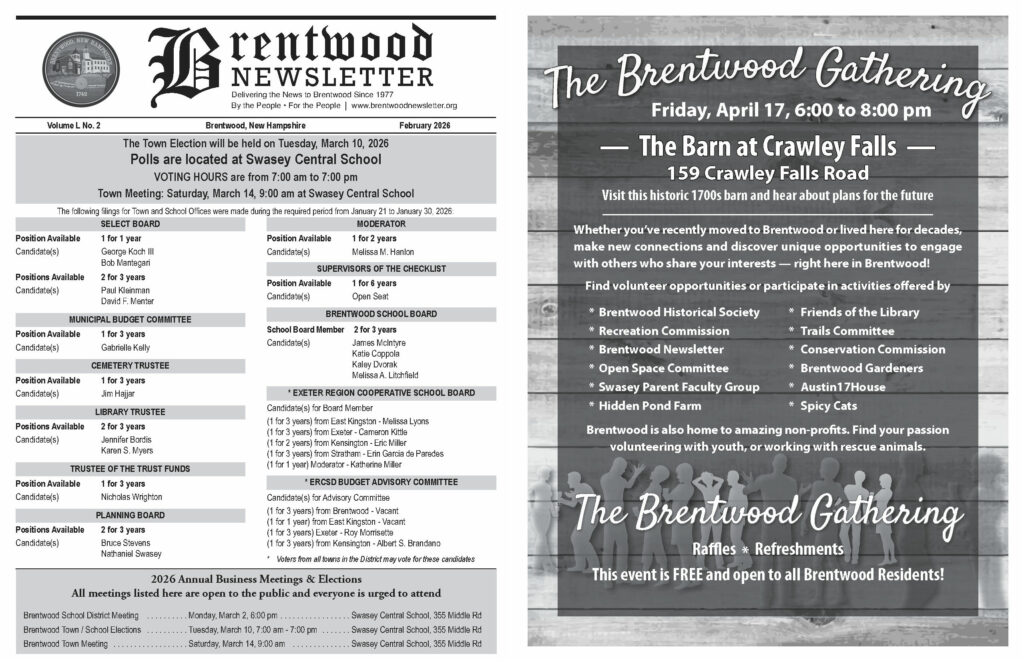 All donations are used for printing, postage and distribution costs. The Brentwood Newsletter is a recognized 501(c)3 non-profit, and a New Hampshire registered charitable organization.